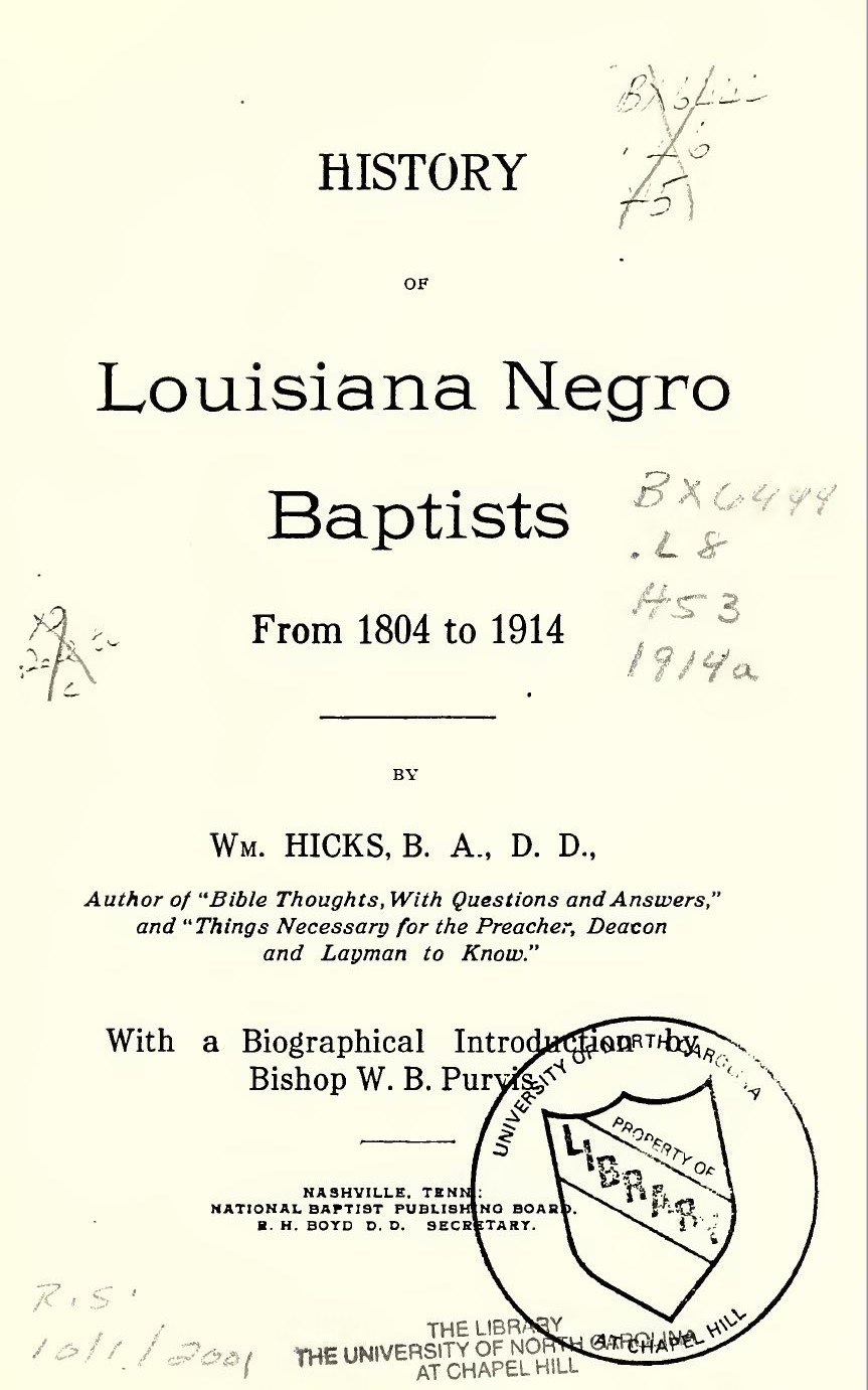 Hicks, William. “History of Louisiana Negro Baptists” With a Biographical Introduction by Bishop W. B. Purvis. Nashville, Tenn: National Baptist Publishing Board, 1804-1914. Internet Archive. Web. 26 March 2012. 13 October 2022. <https:// archive.org/ details/ historyof louisia00hick/>.