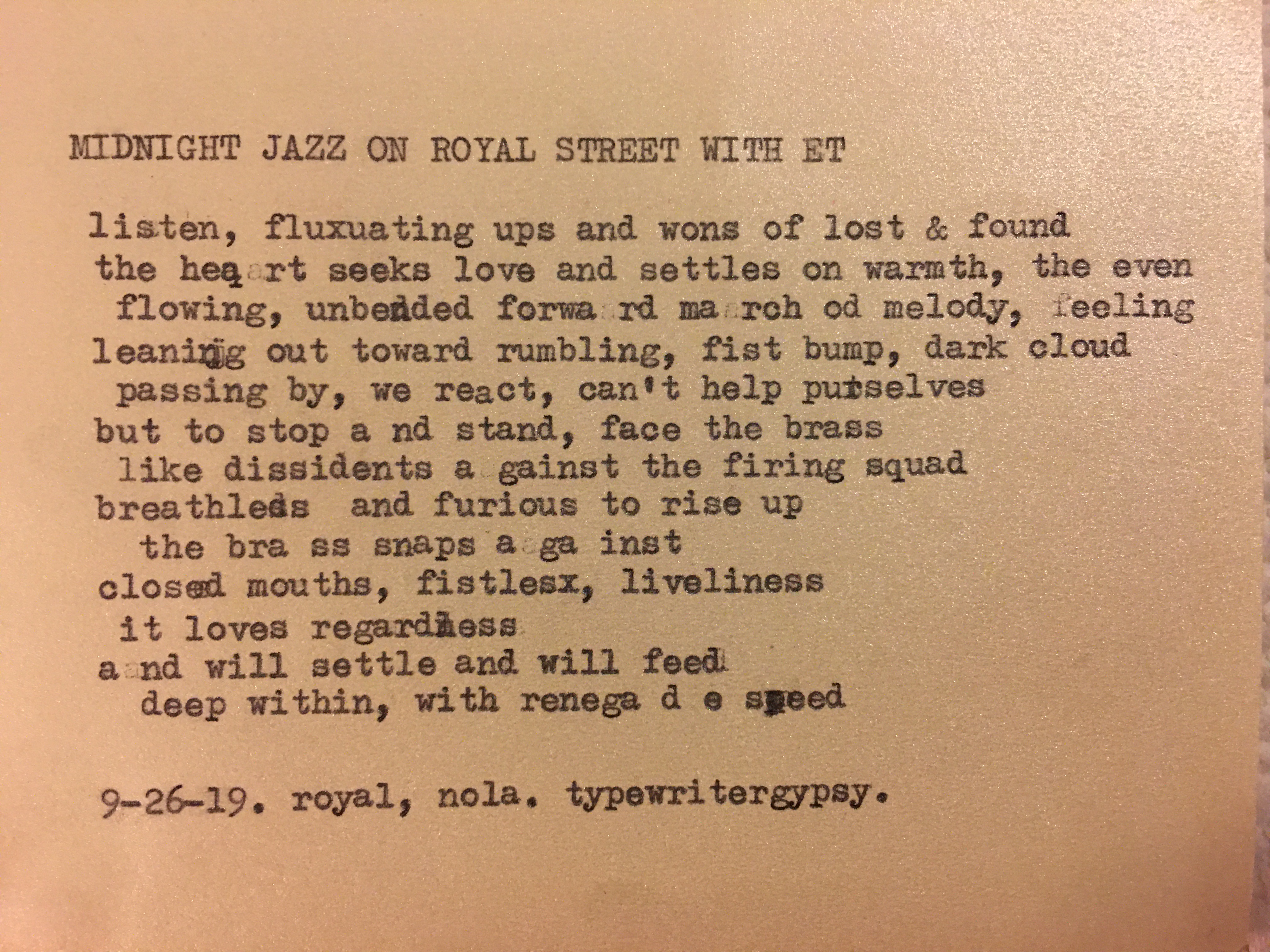 Jean, Stevie (@typewritergypsy). “Midnight Jazz on Royal Street with ET.” Manuscript. 26 September 2019.