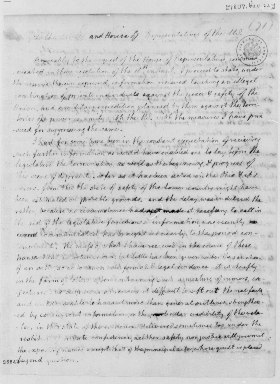 Some time in the latter part of September, I received intimations that designs were in agitation in the western country, unlawful and unfriendly to the peace of the Union; and that the prime mover in these was Aaron Burr, heretofore distinguished by the favor of his country. The grounds of these intimations being inconclusive, the objects uncertain, and the fidelity of that country known to be firm, the only measure taken was to urge the informants to use their best endeavors to get further insight into the designs and proceedings of the suspected persons, and to communicate them to me.