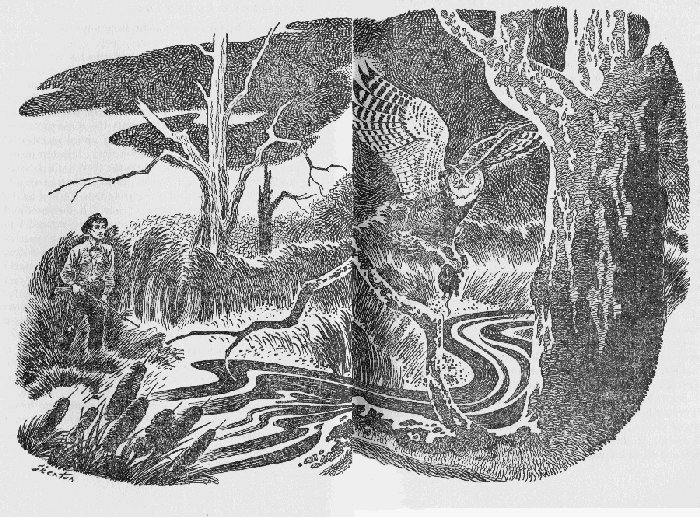 Andy resumed his daily patrols. The owls were still present and, as Andy discovered when one plucked a rabbit from under his very nose, still ravenous. But muskrats that had been ice-bound for weeks were frantic for a taste of fresh food. They swarmed out of dens and houses to dig in the mud for anything succulent. Their very eagerness made them careless. Andy shot a bobcat with a muskrat in its mouth, found where a great horned owl had taken one, and a fox another. But there was no great wave of predators immediately.