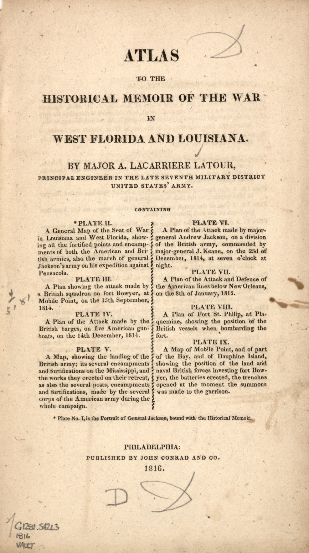 Latour, Major Arséne Lacarriére. Historical Memoir of the War in West Florida and Louisiana in 1814-15. With an Atlas. Trans. H. P. Nugent. Philadelphia: John Conrad & Co., 1816. Internet Archive. 29 Sept. 2010. Web. 9 July 2013. <http:// archive. org/ details/ historical memo00lato>.
