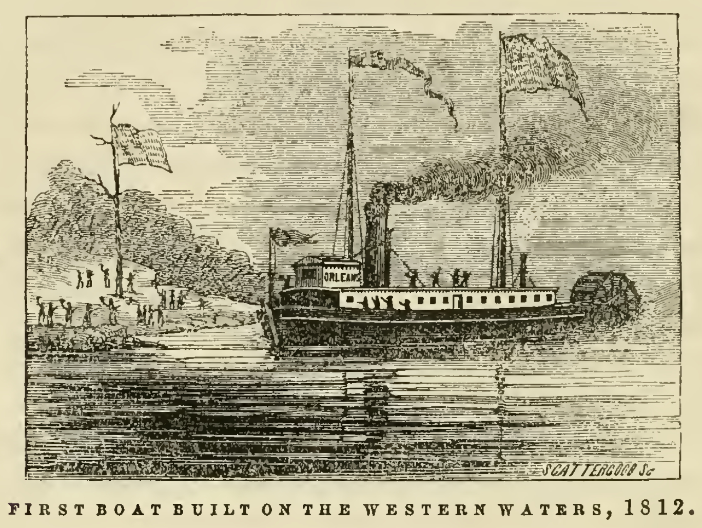 The people of Pittsburg turned out in mass and lined the banks of the Monongahela to witness the departure of the Steamboat; and shout after shout rent the air, and handkerchiefs were waived, and hats thrown up by way of “God speed” to the voyagers, as the anchor was raised, and heading up stream for a short distance, a wide circuit brought the New Orleans on her proper course, and, steam and current aiding, she disappeared behind the first headlands on the right bank of the Ohio.