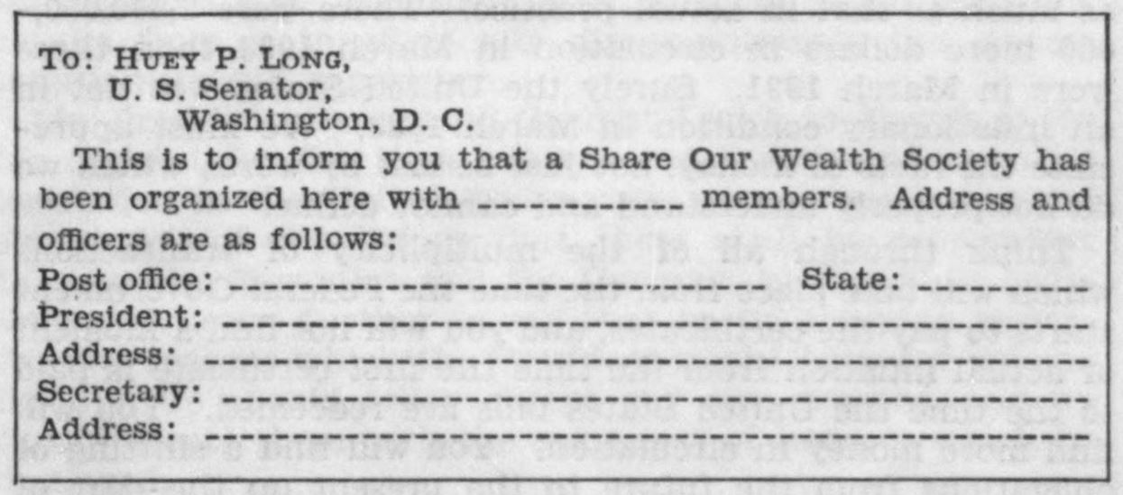 Now, here is what I ask the officers and members and well-wishers of all the Share Our Wealth Societies to do — two things, to wit: