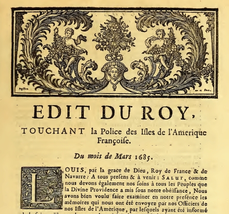 Louis XIV and Jean-Baptiste Antoine Colbert, Marquis of Seignelay. Le Code Noir ou Edit du Roy, Servant de Reglement Pour le Gouvernement & l’Administration de Justice & la Police des Isles Françoises de l’Amerique, & pour la Discipline & le Commerce des Negres & Esclaves dans ledit Pays.: Donné à Versailles au mois de Mars 1685. Avec l’Edit du mois d’Aoust 1685. portant établissement d’un Conseil Souverain & de quatre Sieges Royaux dans la Coste de l’Isle de S. Domingue. Paris: Au Palais, 1735. Web. 27 Feb. 2012. <http://archive.org/ details/ le code noir ouedi00 fran>.