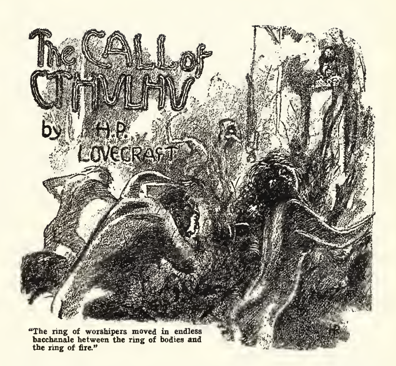 Then, whispered Castro, those first men formed the cult around tall idols which the Great Ones shewed them; idols brought in dim eras from dark stars. That cult would never die till the stars came right again, and the secret priests would take great Cthulhu from His tomb to revive His subjects and resume His rule of earth. The time would be easy to know, for then mankind would have become as the Great Old Ones; free and wild and beyond good and evil, with laws and morals thrown aside and all men shouting and killing and revelling in joy. Then the liberated Old Ones would teach them new ways to shout and kill and revel and enjoy themselves, and all the earth would flame with a holocaust of ecstasy and freedom. Meanwhile the cult, by appropriate rites, must keep alive the memory of those ancient ways and shadow forth the prophecy of their return.