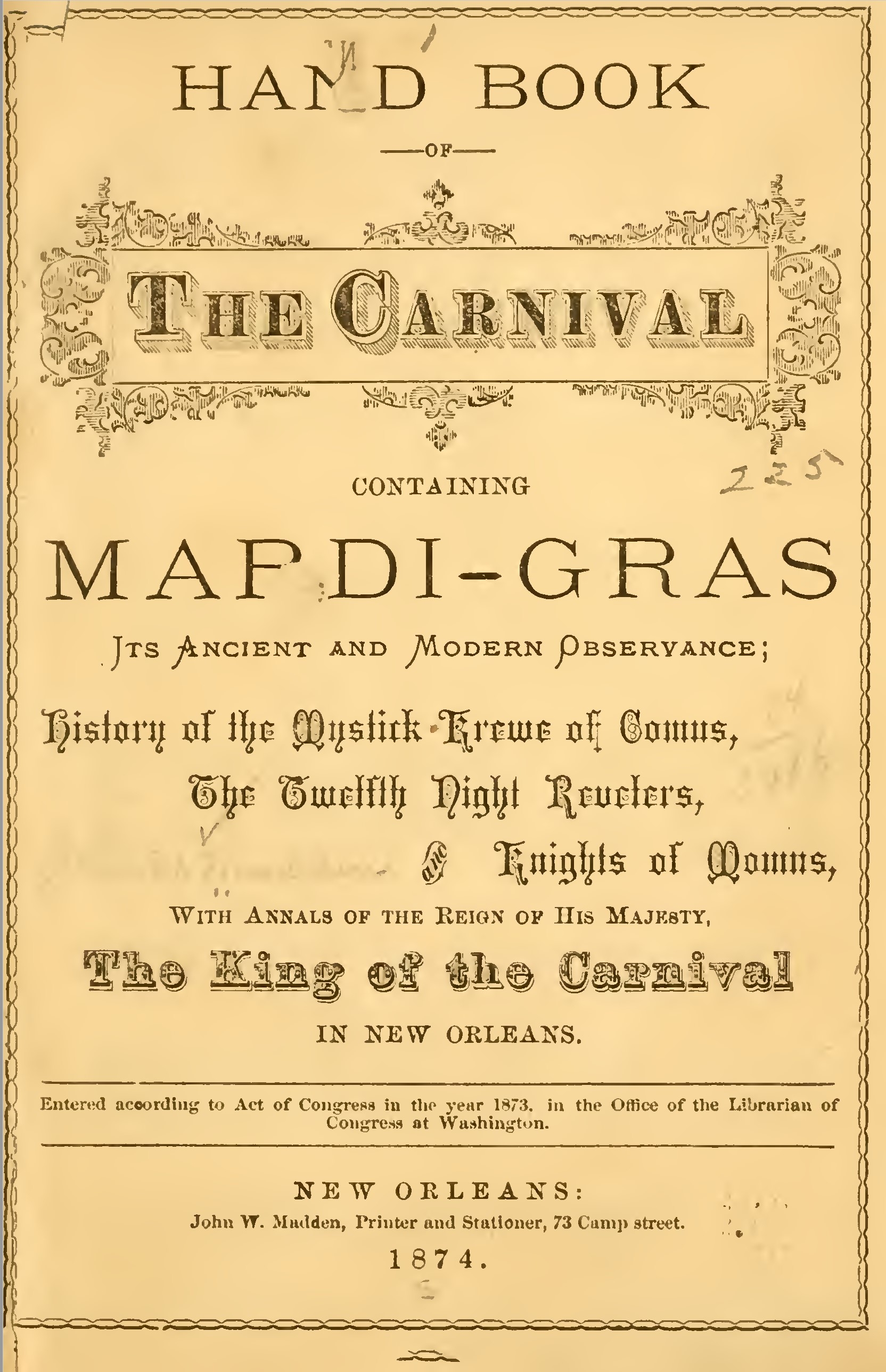 Madden, John W. Hand Book of the Carnival, Containing Mardi-Gras, Its Ancient and Modern Observance; History of the Mystick Krewe of Comus, The Twelfth Night Revelers, and Knights of Momus, With Annals of the Reign of His Majesty, the King of the Carnival. New Orleans: John W. Madden, 1874. Internet Archive, 18 December 2008, https:// archive.org/ details/ handbook ofcarniv 00madd, Accessed 3 November 2022.
