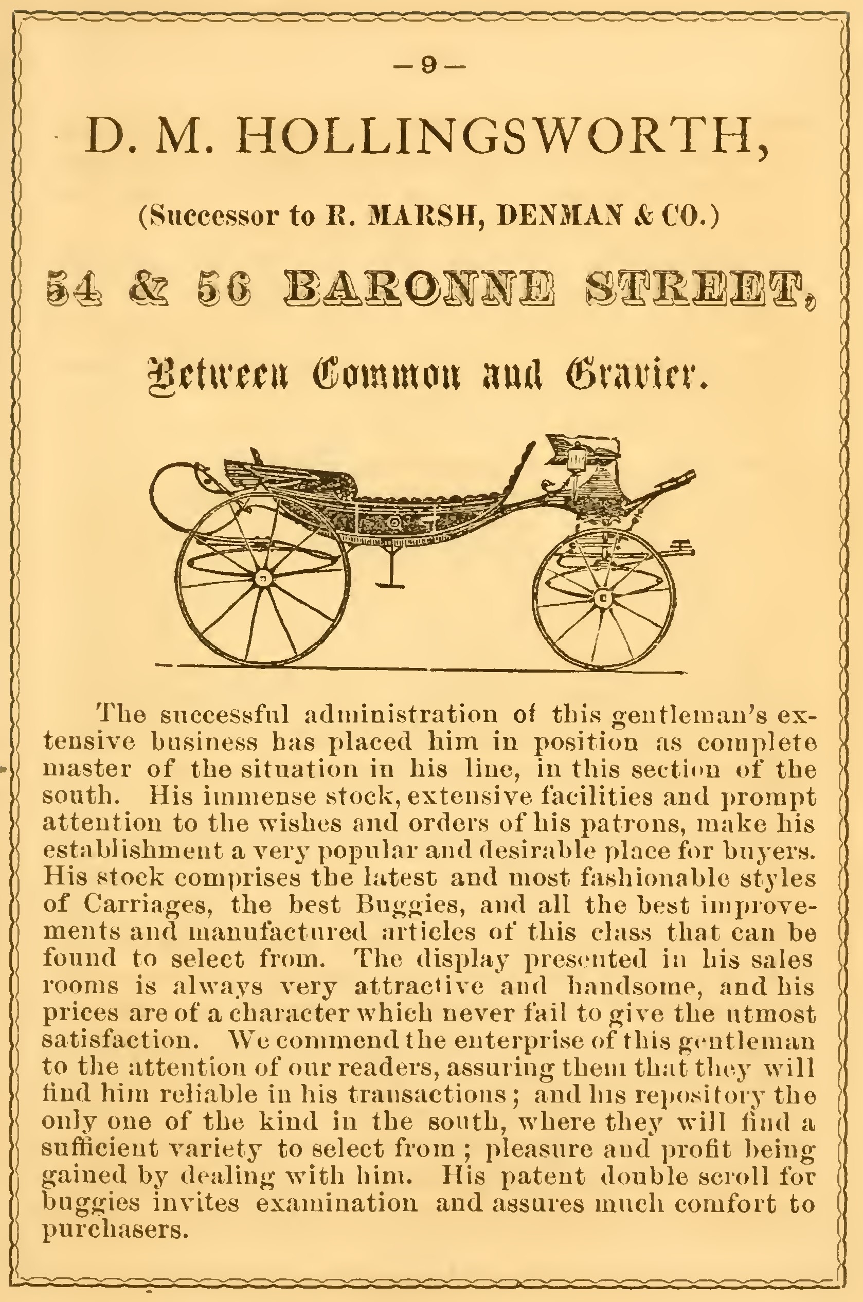 This division, consisting of all kinds of vehicles, persons on horseback or on foot, platforms on wheels, on which were displayed all sorts of articles representing any trade or business, all under the command of the Lord High Sheriff of the Guild, formed on the south side of Canal street, it right resting on Camp street, and extending towards the river.