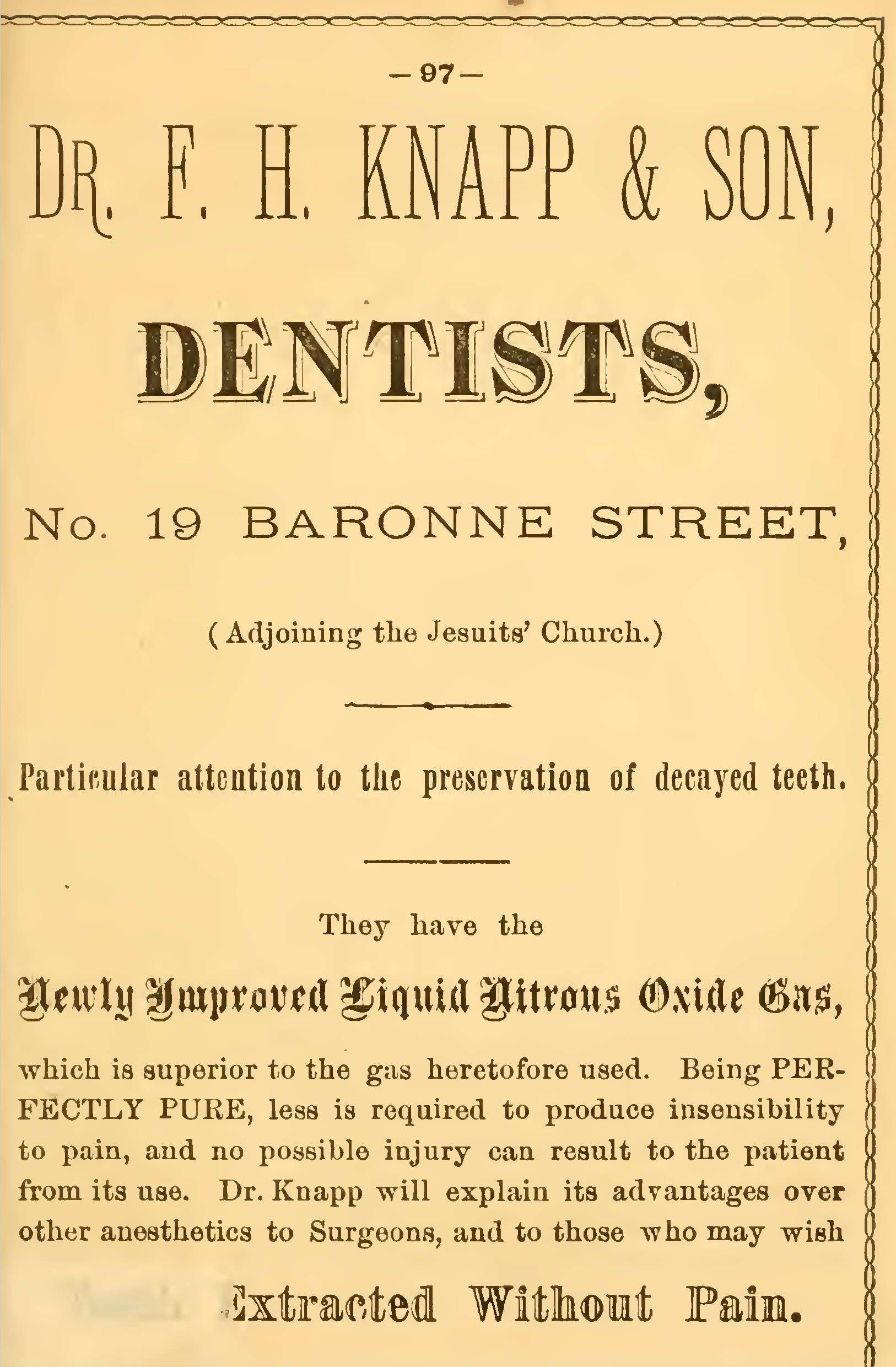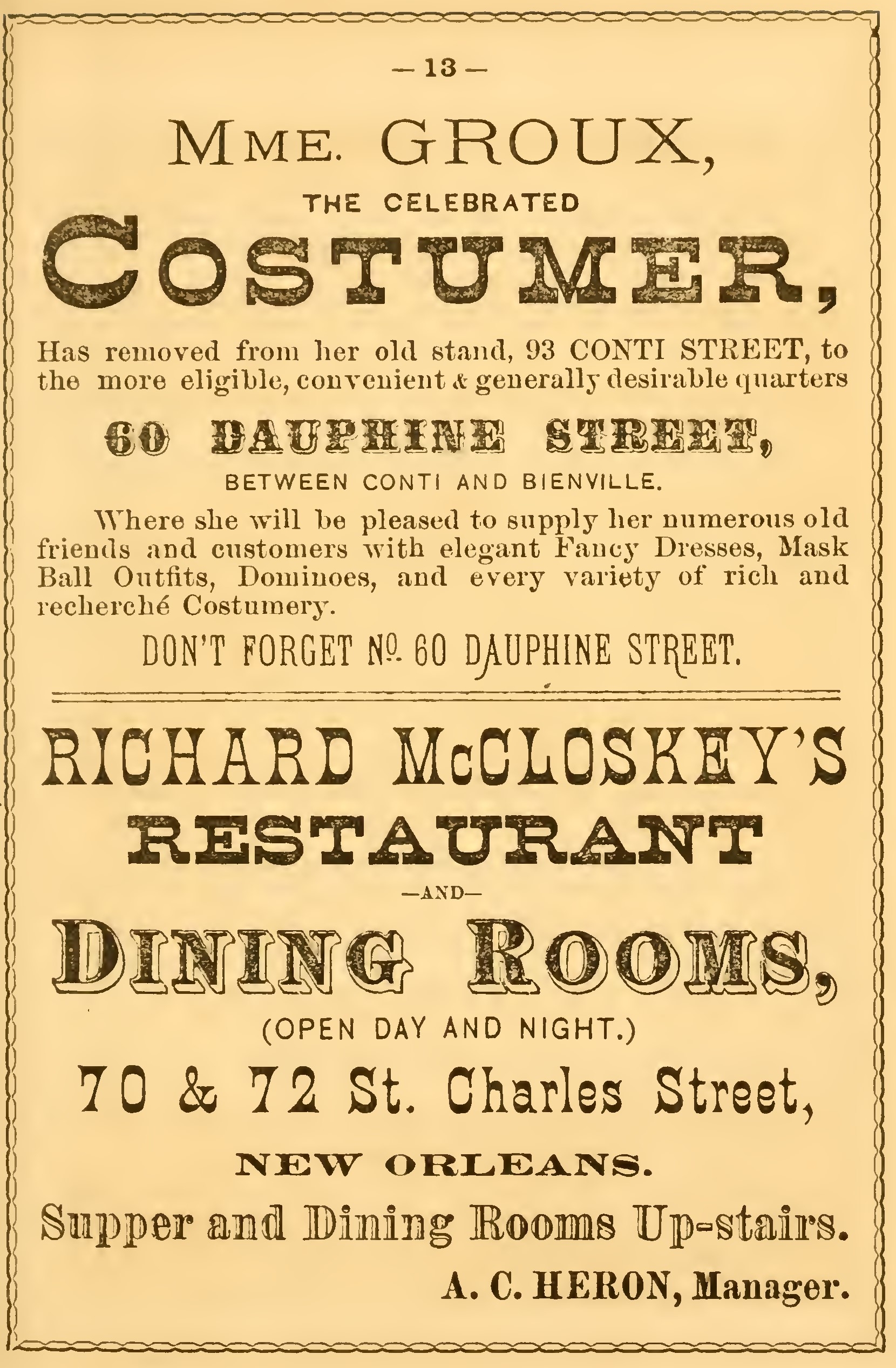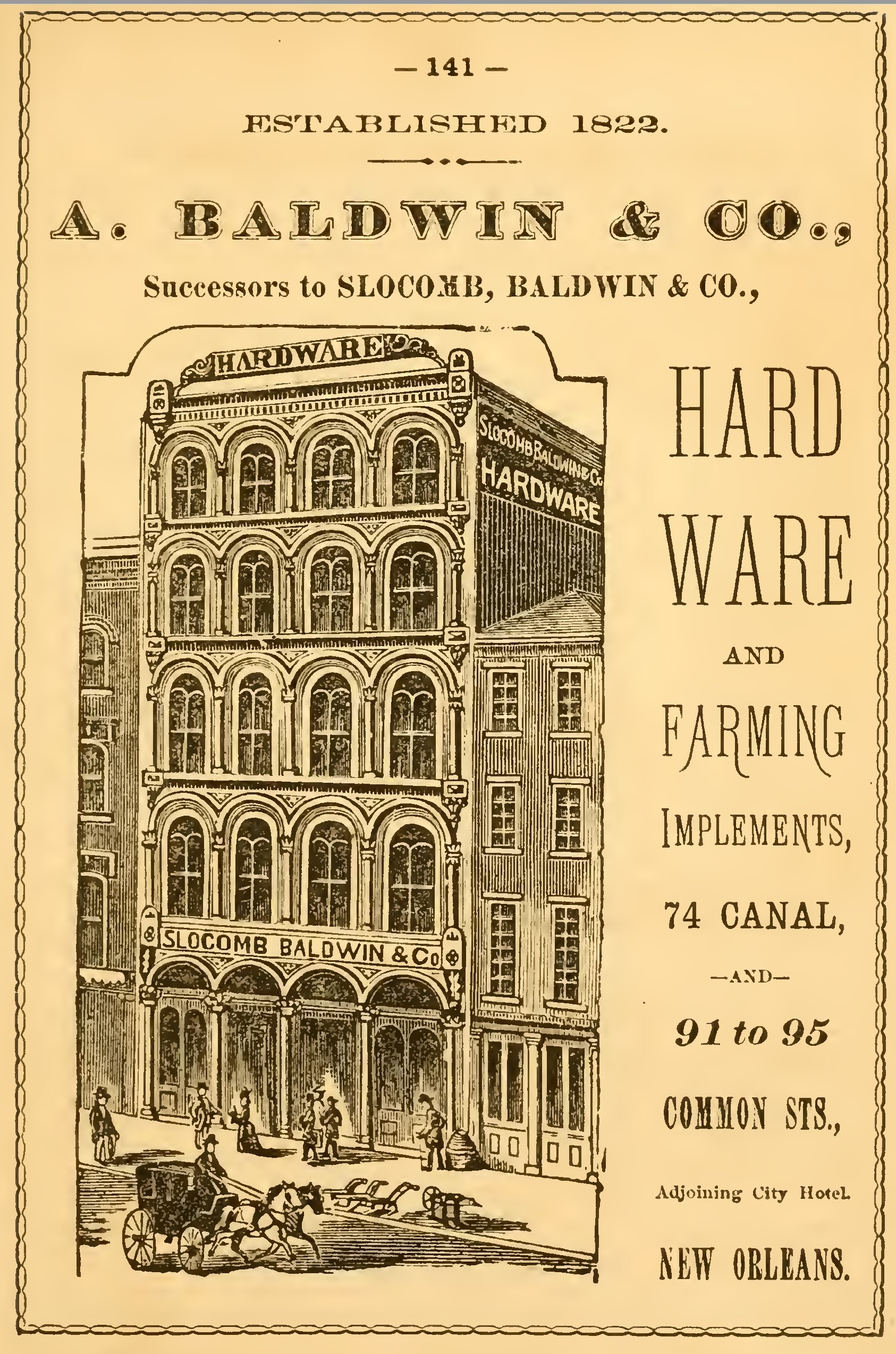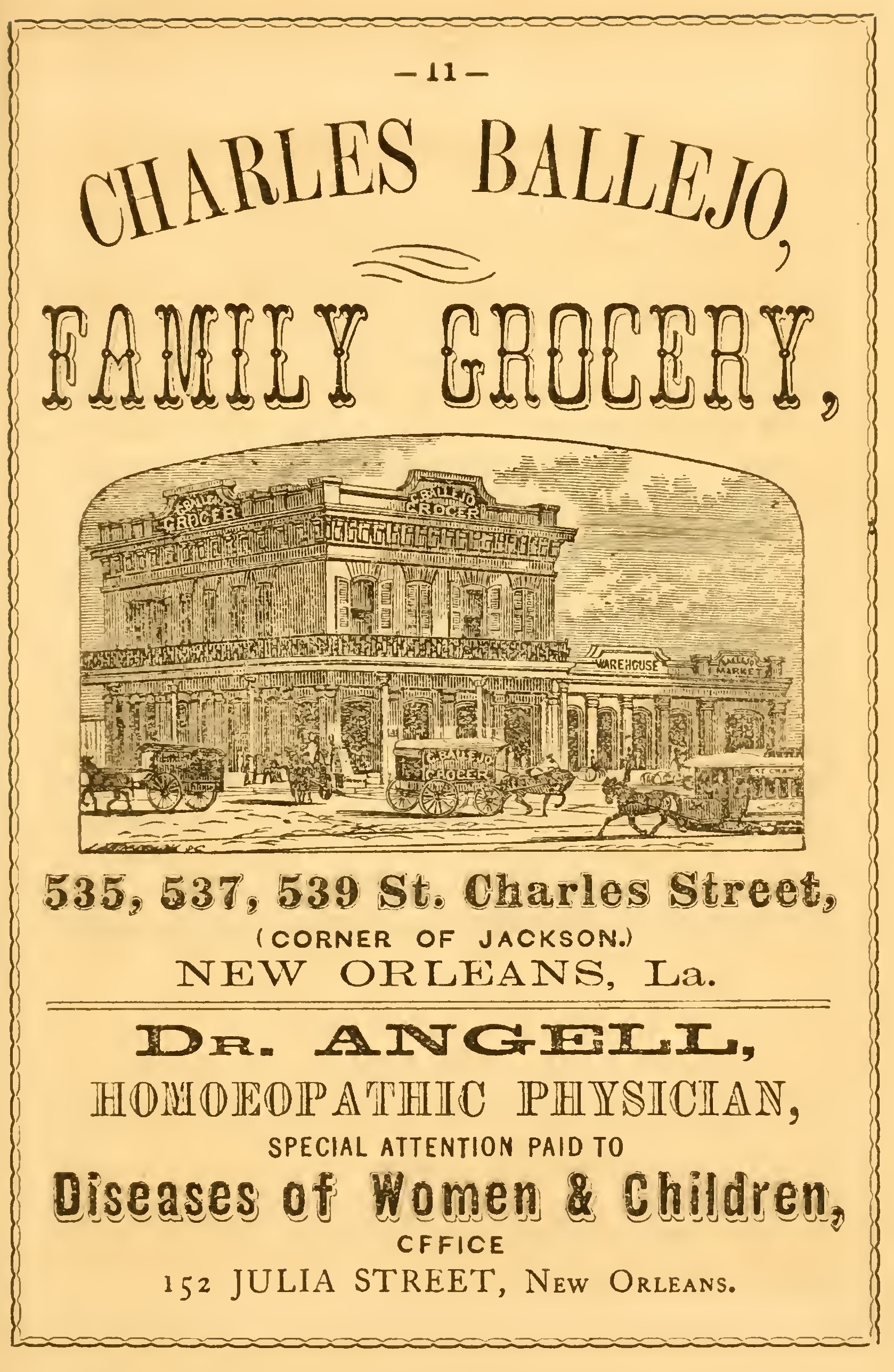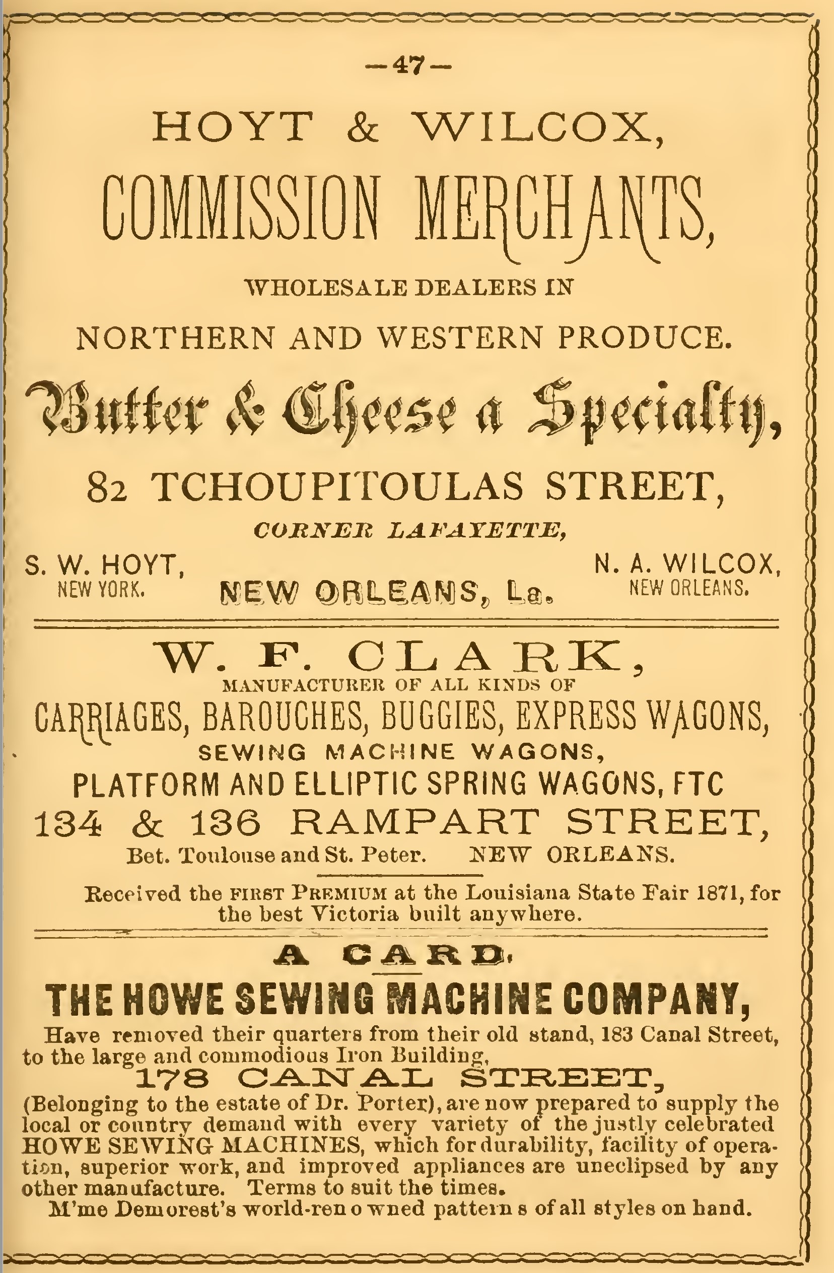 The St. Charles Theatre, the offices of the Times and Picayune, the establishments of Messrs. Heath & Lara, upholsterers, E. C. Palmer & Co., stationers, Rice Bros, & Co., stove and hardware dealers, R. M. & B. J. Montgomery, auctioneers and dealers in furniture, and T. E. Suter, painter, were tastefully illuminated, the front of their respective buildings being decorated with appropriate designs.