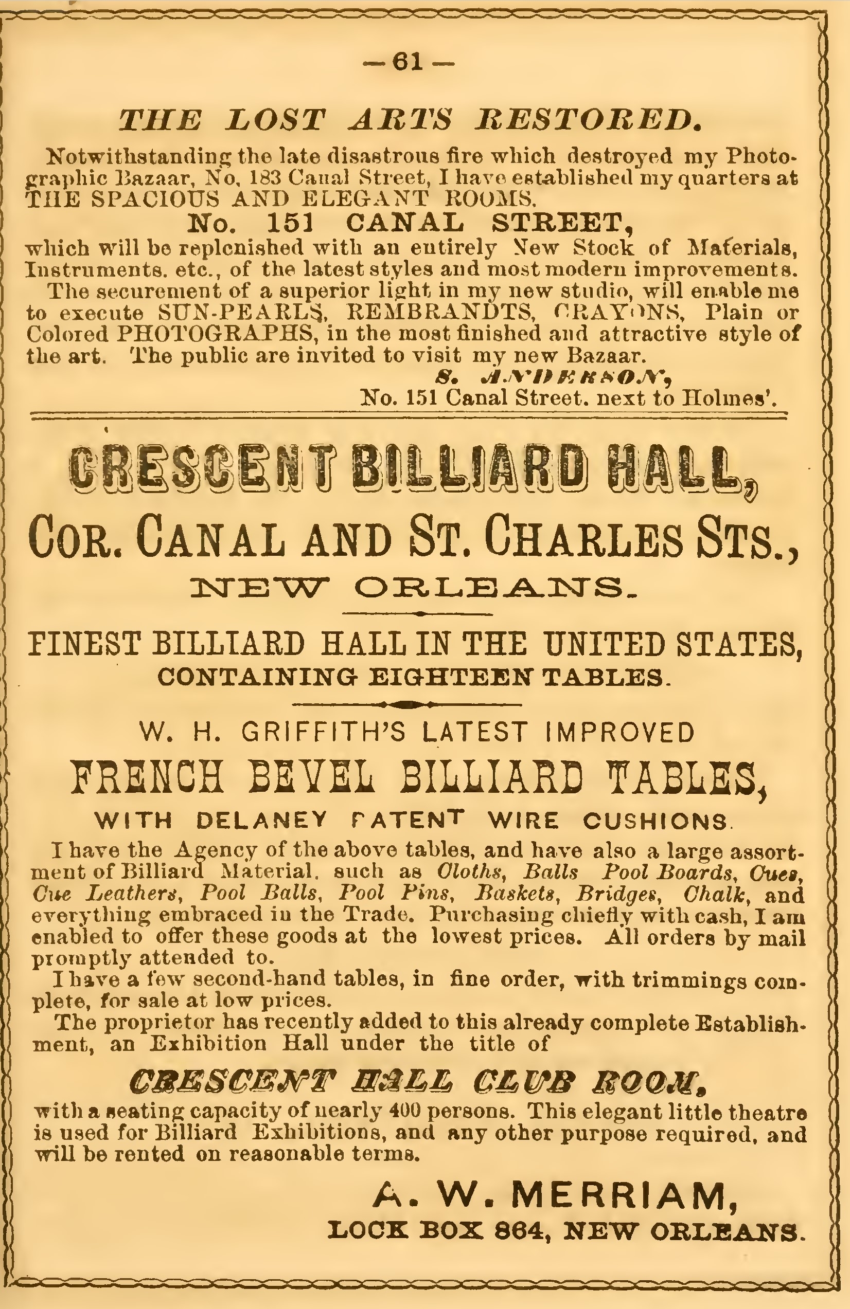 corner of Canal and St. Charles streets, where that genial and ever popular gentleman, Col. Walter Merriam presides, was brilliantly illuminated and its splendid front looked fresher than ever.