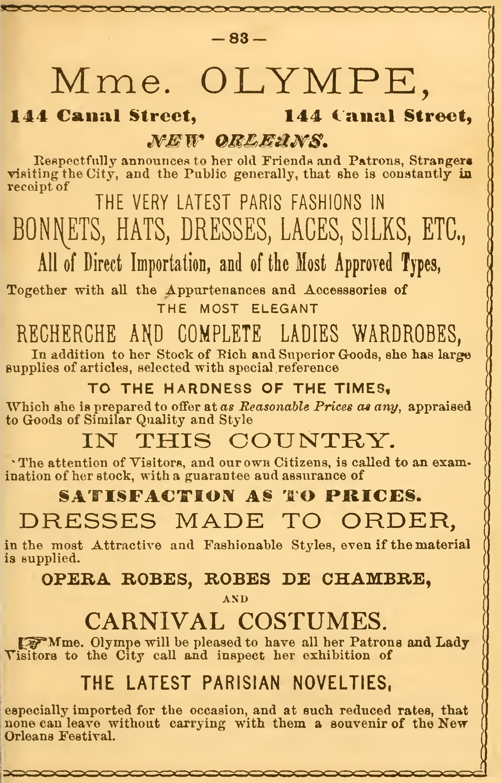 Having our own manufactory and the goods being made up under our own supervision, we can guarantee good and prompt Work. Floating aloft the orauge colored banner, announced the approach of this department. This division was composed of some ten or twelve carriages freighted with beautifully dressed mortals robed in garments of variegated hues, rivaling the gaudy colors of the rainbow.