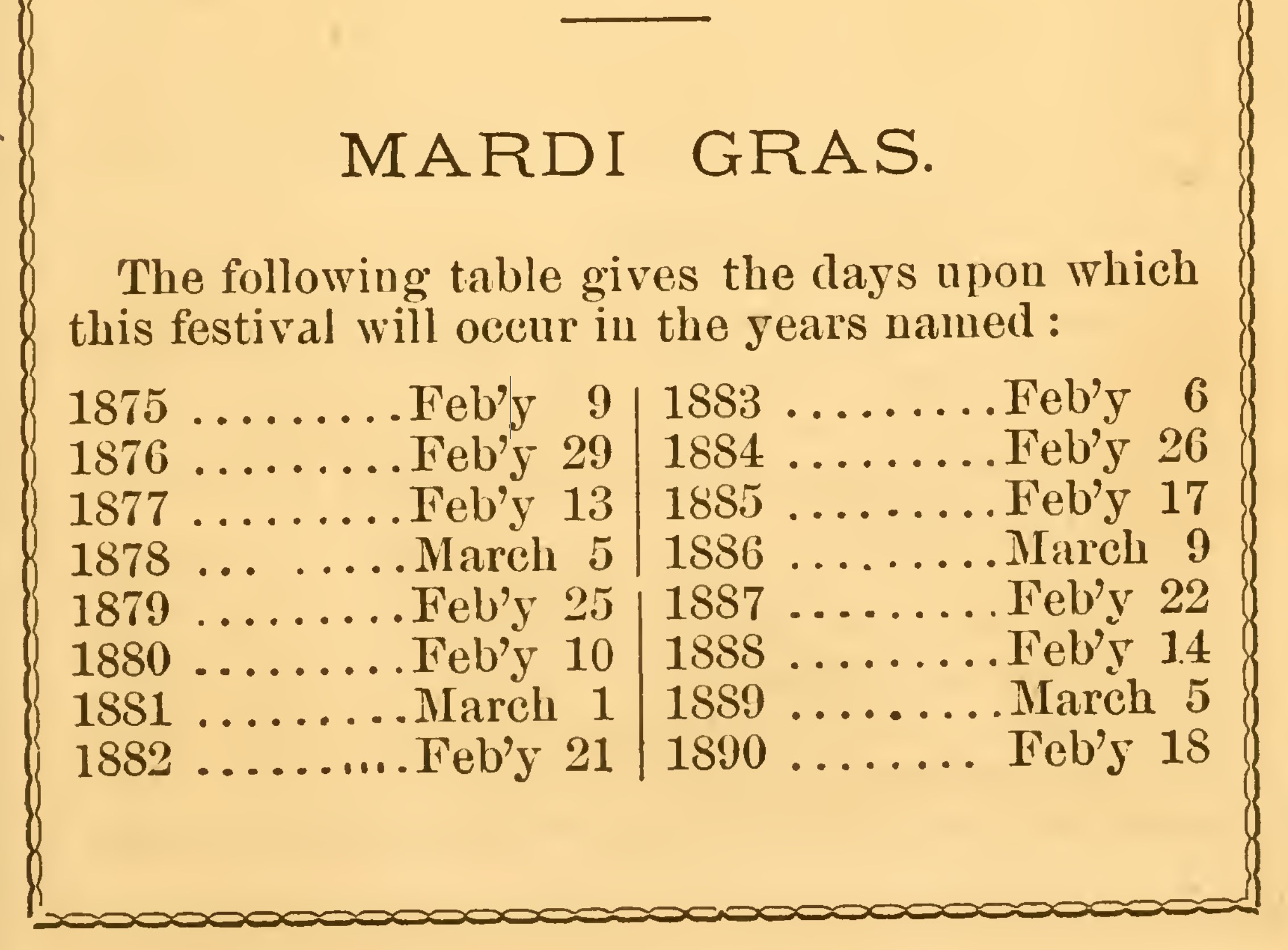 The Carnival, properly speaking, begins with the first of the new year, and the festivities commencing with the congratulations and friendly wishes appropriate to that time, increase in fervor until they end in the wild whirl of the grotesque and merry parades and shows of Mardi-Gras (Fat Tuesday) so-called in France, the “favorite child of the church” because it is followed by Ash-Wednesday, ushering in the solemn season of Lent.