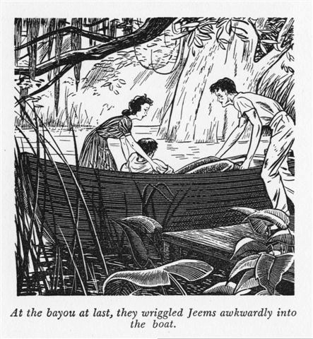 - At the bayou at last, they wriggled Jeems awkwardly into the boat