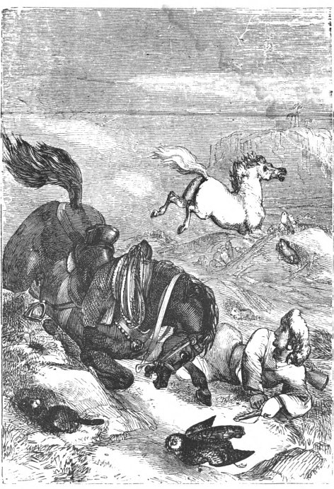 Next morning the boy hunters were up and stirring at the “peep of day.” They felt refreshed and cheerful. So did their animals, for the grass was good. Jeanette was frisking about on her trail-rope and endeavouring to reach “le chat,” whom she would have kicked and bitten to a certainty, but that the lasso-tether restrained her. Jeanette little dreamt how near she had been to her last kick. Had she known that, it is probable she would have carried herself with more sobriety, not knowing but that a similar necessity might occur again. But Jeanette knew nothing of it; and, having eaten well and drunk plentifully, she was as frisky as a kitten.