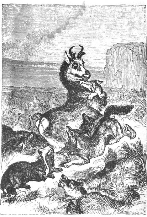 On reaching the ridge that overlooked the valley, what was their surprise to see the buffalo once more upon his feet, and surrounded by a score of snapping, snarling wolves! These were rushing upon him from all sides at once; while the wounded bull was turning briskly about, and endeavouring to keep them at bay with his horns. Some of the wolves were seen stretched out on the ground—to all appearance dead—while their companions kept up the attack with unrelenting fury. The eyes of the buffalo flashed fire, as, wheeling round and round, he endeavoured to keep his assailants in front of him.