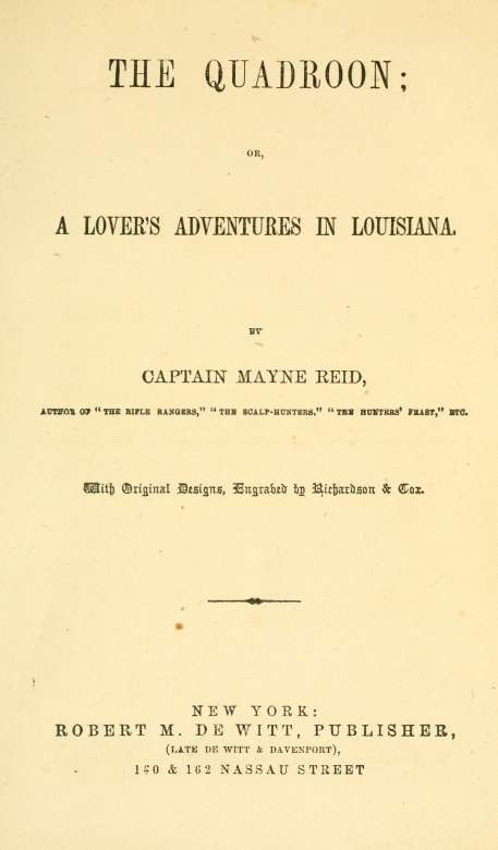 Reid, Captain Mayne. The Quadroon: A Lover's Adventures in Louisiana. Illus. Richardson & Cox. New York: Robert M. De Witt, 1856.