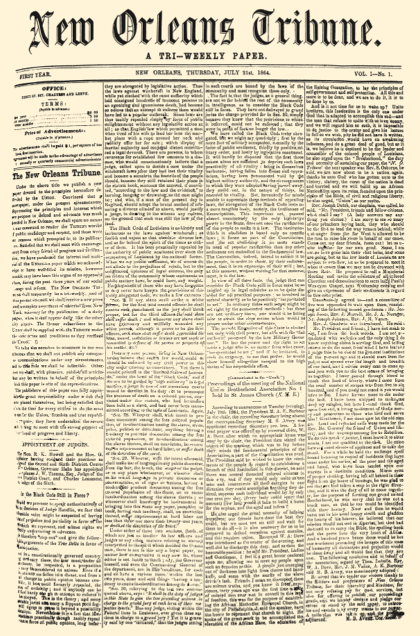 Roudanez, Louis Charles. “Is the Black Code Still in Force?” New Orleans Tribune, 21 July 1864, p. 1. Roudanez: History and Legacy. “Is the Black Code Still in Force?” Facebook, 21 July 2022, 9:51 p.m., https:// www. facebook. com/ 84268593 5851803/ posts/ pfbid02kA jYHqMzS6b wCqu6kA7rV9mc Yvhark1Jnem2h2 so4kqqVNtNZQe JyASUMZF 5tJ78l/ ?d=n. Accessed 25 July 2022. © Roudanez: History and Legacy. Used by permission. All rights reserved.