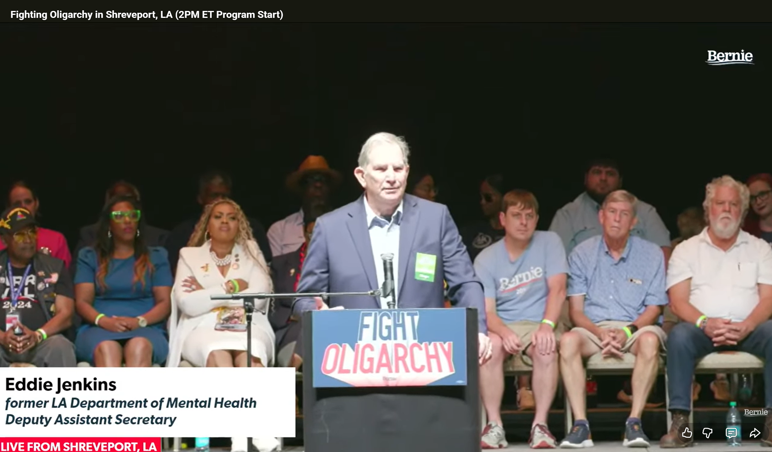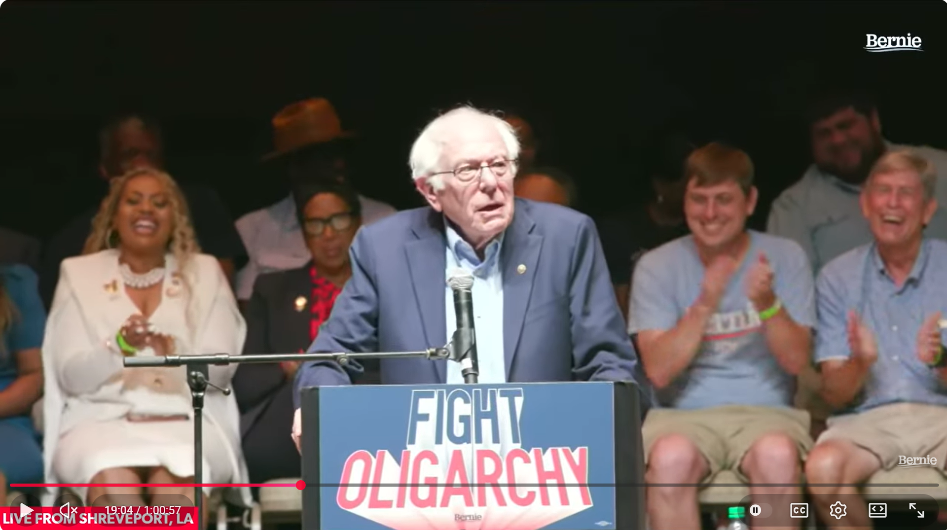 Our Fighting Oligarchy Tour, which has now done 20 events in 14 states, has brought out brought out over 260,000 Americans. And those are Democrats, Republicans, and independents coming together. And just last weekend on Saturday, there were No King Rallies. You all know the No King Rallies — you had one here in Shreport, I understand — well we had about 40 of them all over the state of Vermont, and what people are saying loudly and clearly is,