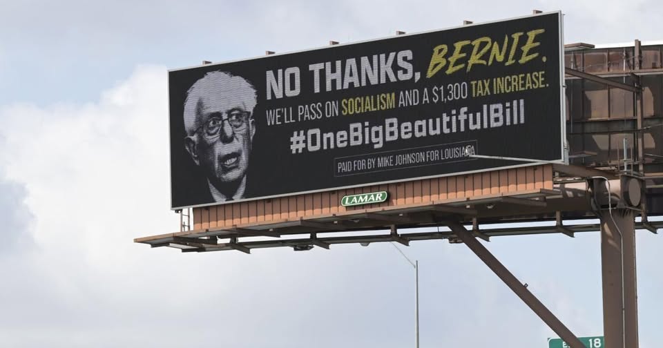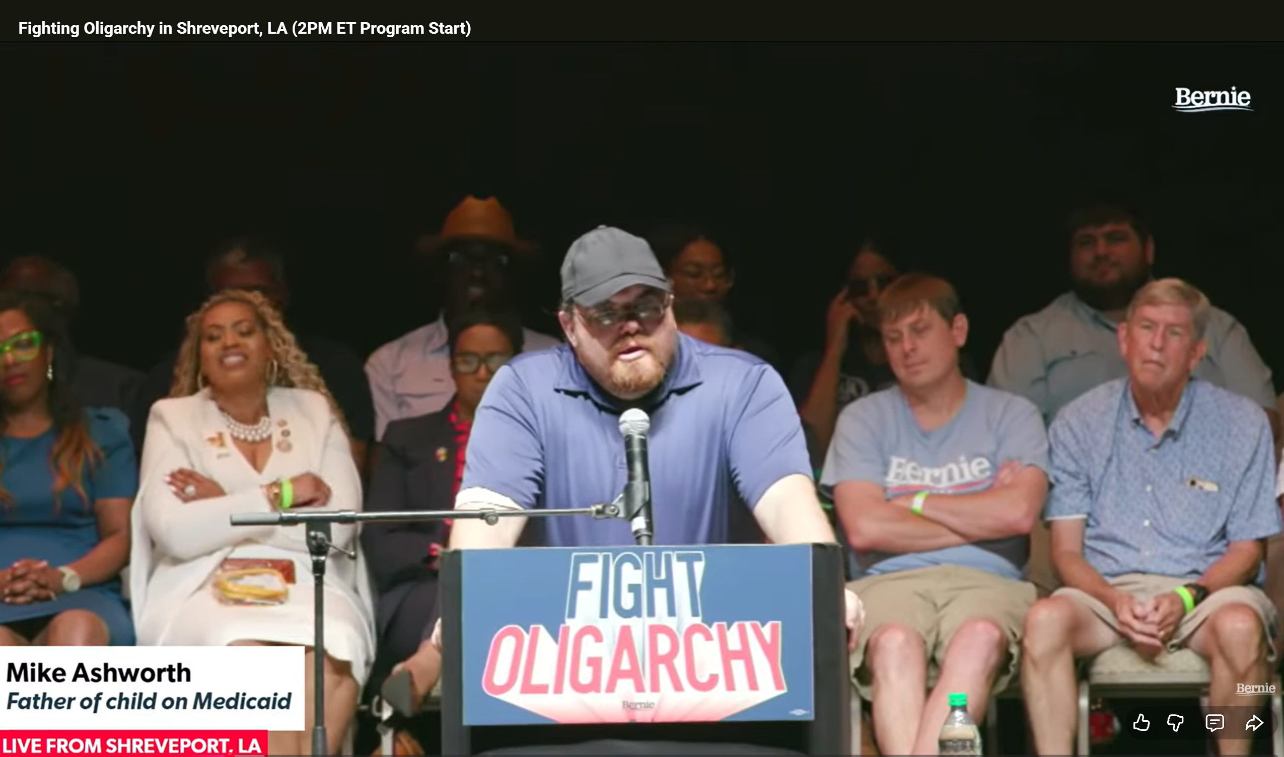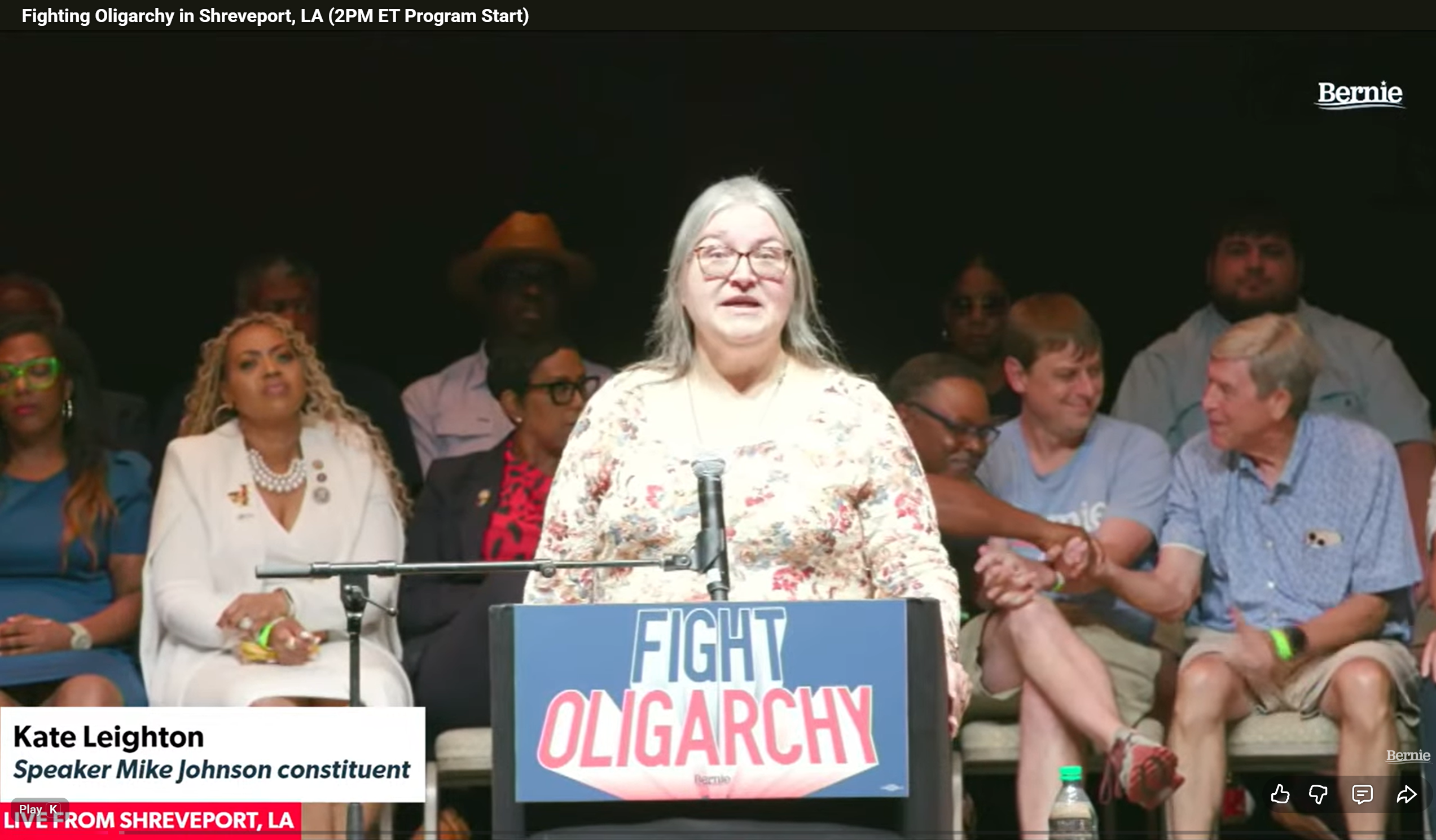 Our Fighting Oligarchy Tour, which has now done 20 events in 14 states, has brought out brought out over 260,000 Americans. And those are Democrats, Republicans, and independents coming together. And just last weekend on Saturday, there were No King Rallies. You all know the No King Rallies — you had one here in Shreport, I understand — well we had about 40 of them all over the state of Vermont, and what people are saying loudly and clearly is, “No,” to oligarchy. “No,” to a government of the billionaire class. “No,” to authoritarianism and a President a President who clearly has not read or understood what the Constitution of the United States is about. “No,” to kleptocracy and a President who’s going to make hundreds of millions of dollars off of his role as President. And “No,” to Speaker Johnson’s bill, which gives massive tax breaks to billionaires.