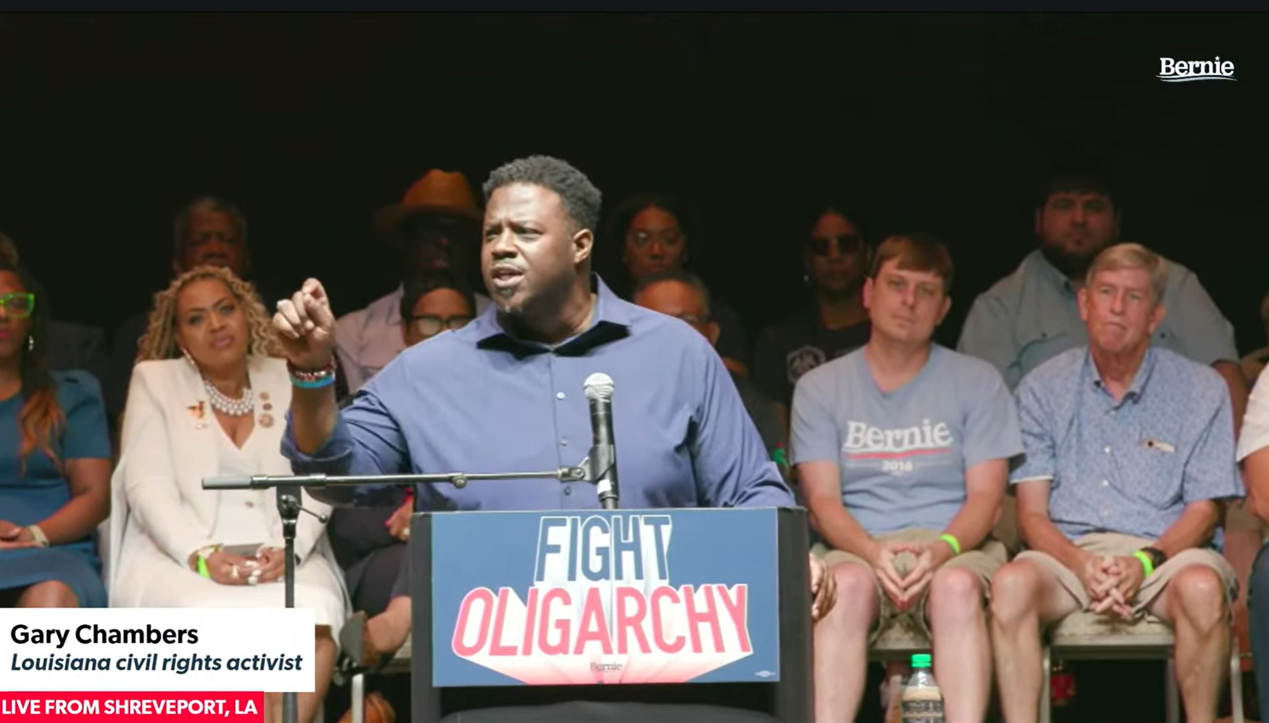 And I want to say a word about why I am in Louisiana today, why I was in Macallen Texas last night, why we’re going to be in Tulsa Oklahoma this evening, why we’re going back to Texas tomorrow, and the reason is I do not believe in this red-state blue-state nonsense.I believe that whether you live in Louisiana or Texas or Vermont or Massachusetts, I believe that the vast majority of the American people believe in economic justice.They believe in social justice. They understand that climate change is real and a threat to humanity.They believe in racial justice and an end to bigotry in all of its forms,so our job, whether we come from a conservative state or a progressive state, is to bring our people together and not to let people divide us up.