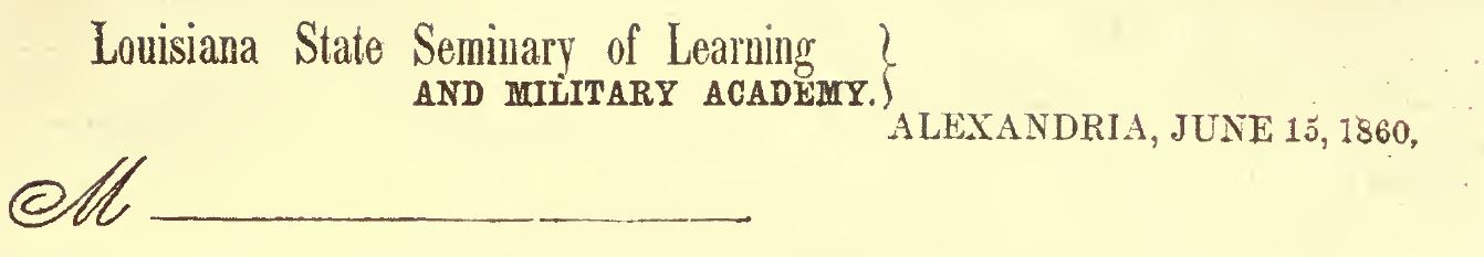 At a meeting of the Board of Supervisors of the Louisiana State Seminary of Learning, at Alexandria, Aug. 2, 1859, I was elected professor of engineering, architecture, and drawing and superintendent thereof. The action of the board was wholly the result of the recommendation of Major Don Carlos Buell, then in Washington, and of Gen. G. Mason Graham, half-brother to my old chief, Gen. [R. B.] Mason, in California.