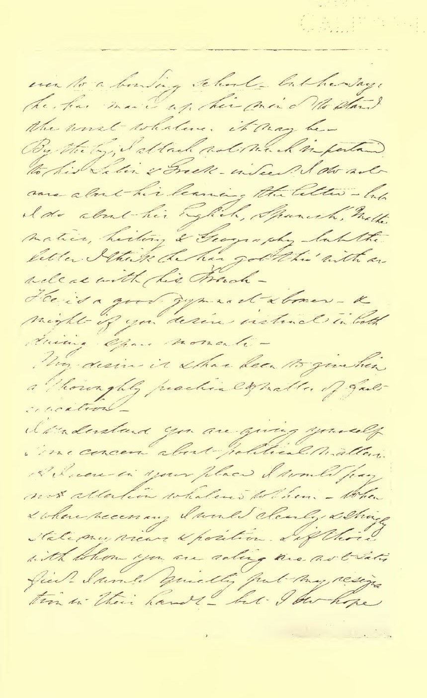 In the meantime, however, I enclose you a paper which presents an opening that I have been disposed to think well of. The only trouble is that the Academy has not yet been secured by state laws, though I think it al together probable that it will be. If you could secure one of the professorships and the superintendency, as I think you could, it would give the handsome salary of $3,500. The paper is sent to me by [George] Mason Graham, General [R. B.] Mason’s half-brother, and explains the whole matter. If you think well of it I have no doubt I can write him such a letter as will secure you a valuable advocate at first, and a useful supporter afterwards. You will observe there is not much time to spare. . .