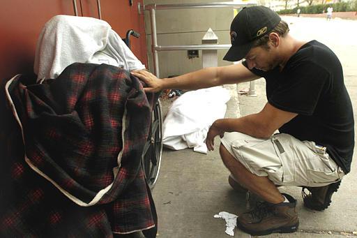 Singer Harry Connick, Jr., prays over two dead bodies outside the New Orleans Convention Center. Sept. 1, 2005.