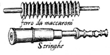 Bartolomeo Scappi, head chef to Pope Pius IV, described a similar dish simply called “fritters” that was squeezed through a syringe or rolled out and cut with a small round tube of metal or the mouth of a carafe dipped in oil. The syringe (see picture) was a cylinder made of brass with a plunger that forced the dough through a star shaped opening in the end. Today you can find a similar instrument called an electric “cookie press” or, for something that more closely resembles a Renaissance syringe, a metal “cake decorator” can be bought wherever kitchen tools are sold. I find that a cloth pasty bag fitted with a star tube is easy to use and holds more paste than a syringe.