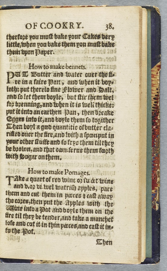 In 16th century England, these fried cakes were called Bennets. They were called spritz kueken and krullers in Germany, and zeppole in Italy. The first recipe below, from A Book of Cookrye published in London in 1584, is basically made by frying the same kind of hot water paste that is used to make baked treats like cream puffs, eclairs, and profiteroles. This kind of hot water paste is now called Choux (French for cabbage) paste because of the shape of the little buns it makes when baked, but it didn’t get that name until the 18th century.