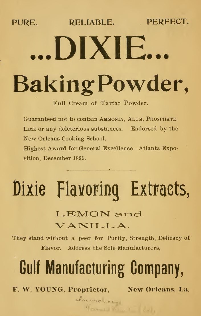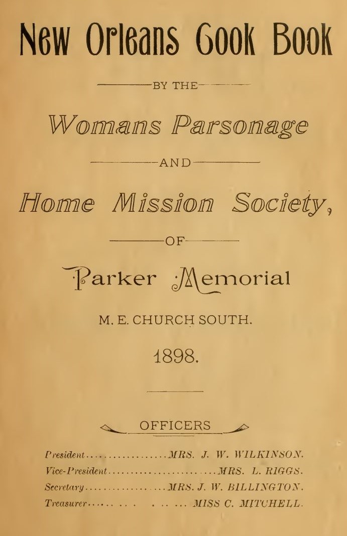 Wilkinson, Mrs. J. W., et al. New Orleans Cook Book by the Womans Parsonage and Home Mission Society, of Parker Memorial M. E. Church South. New Orleans: Parker Memorial M. E. Church, 1898. Archive.org. 21 Jan. 2009. Web. 25 June 2021. <https:// archive.org/ details/ neworleans cookbo01newo>.