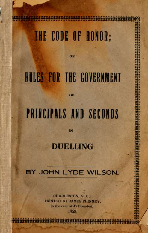 Wilson, John Lyde. The Code of Honor Or, Rules for the Government of Principals and Seconds in Duelling. Charleston, SC: Printed by J. Phinney, 1858. Archive.org. Web. 20 Jan. 2016. <https:// archive.org/ details/ codeof honor orrul00wils>.